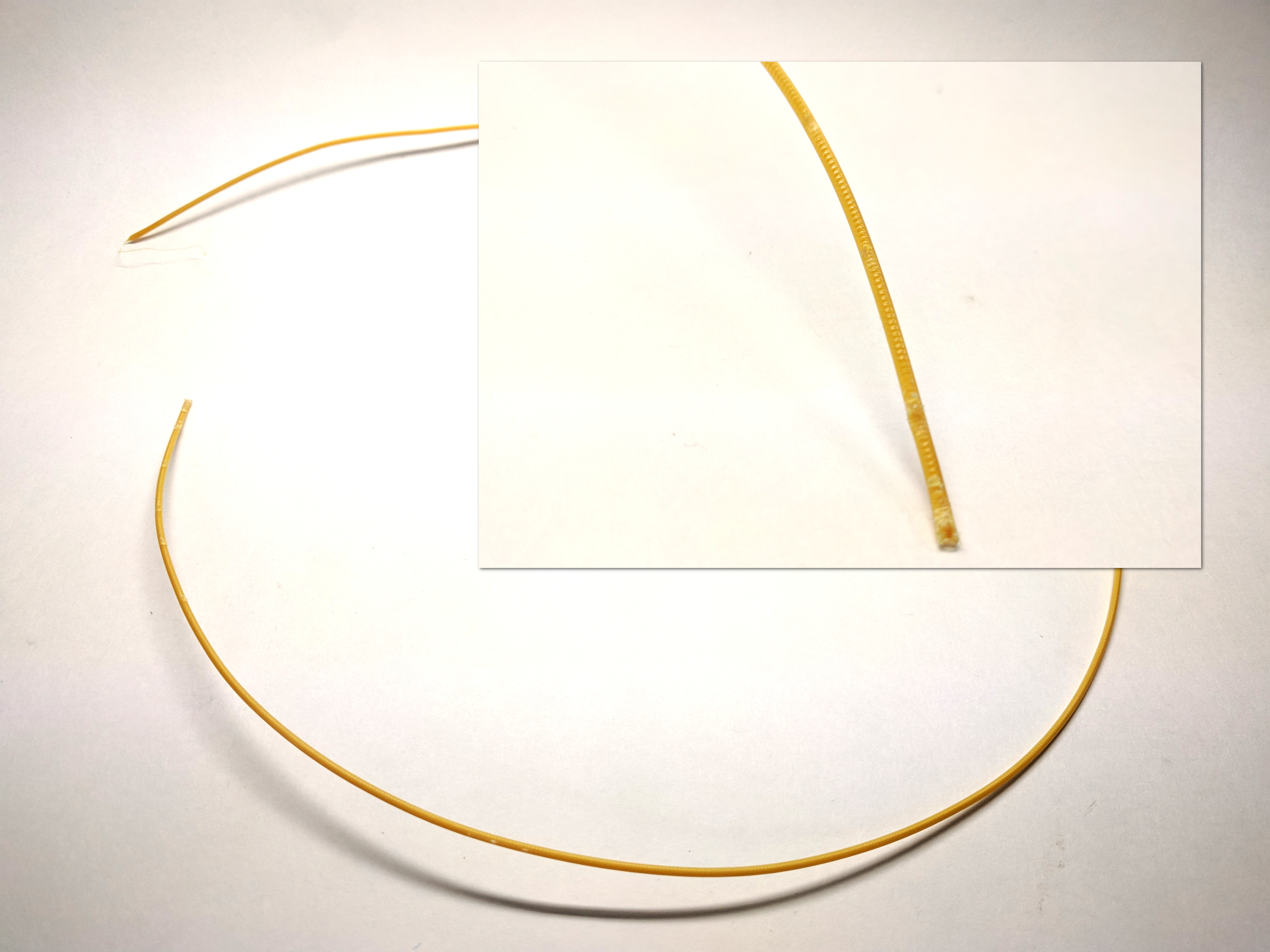 These pictures were taken from a piece of very cool looking pearlescent rainbow filament that we bought from Amazon. We loaded this into a reliable machine, equipped with an XS series Bowden tube, that we had previously used to print dozens of filaments without issue. Six hours into a 32 hour print, the machine clogged. We had to disconnect the ends of the tube and pull the filament out with a pair of pliars because it was lodged so tightly.