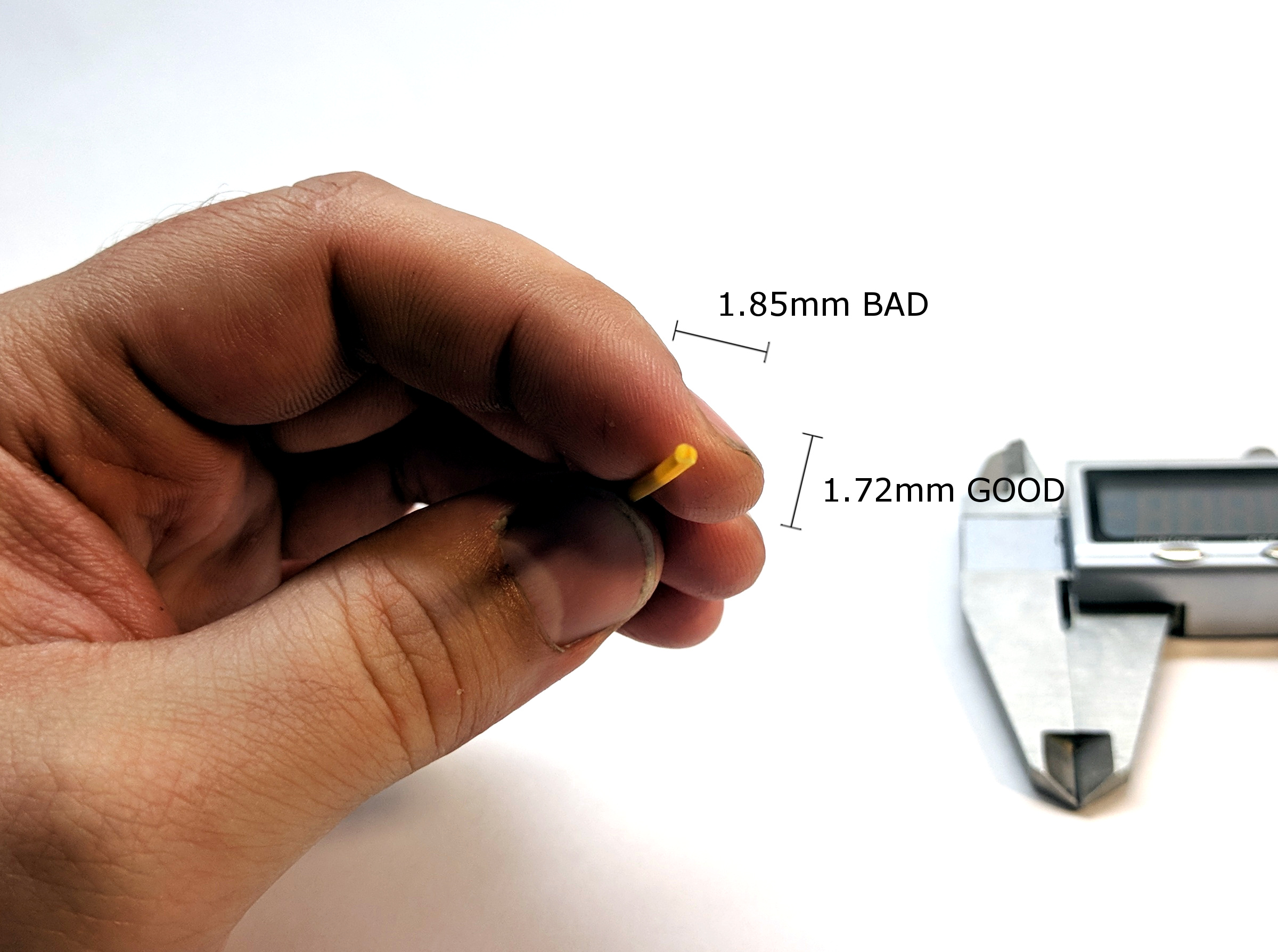 This is the tricky part. Many filaments will appear ok at first. The trouble is, they have a high degree of eccentricity, that is, they are out-of-round. To detect this, what you must do is take one measurement, then rotate the filament 90 degrees and take another measurement.